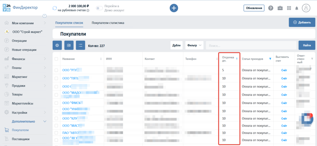 Шаг 1 – В сервисе КУБ24 ФинДиректор установили по клиентам отсрочку платежа в днях.